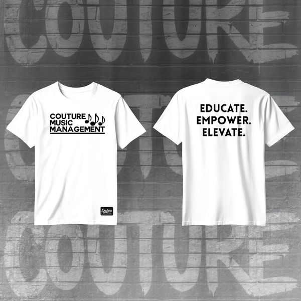 Classic Couture Music Management Logo Short-Sleeve Unisex Tee in White, Back has CMM's Motto "EDUCATE. EMPOWER. ELEVATE."