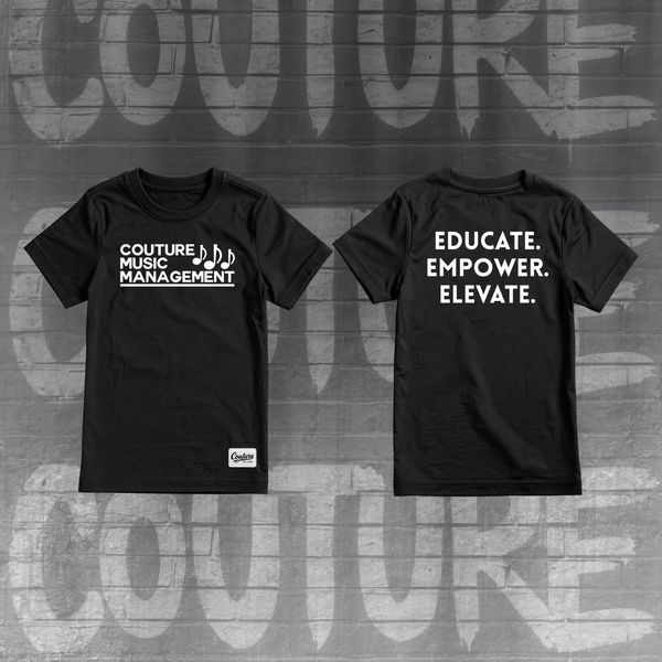 Classic Couture Music Management Logo Short-Sleeve Unisex Tee in Black, Back has CMM's Motto "EDUCATE. EMPOWER. ELEVATE."