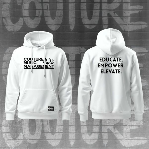 Classic Couture Music Management Logo Hooded Unisex SweatShirt in White, Back has CMM's Motto "EDUCATE. EMPOWER. ELEVATE."
