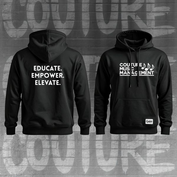 Classic Couture Music Management Logo Hooded Unisex SweatShirt in Black, Back has CMM's Motto "EDUCATE. EMPOWER. ELEVATE."